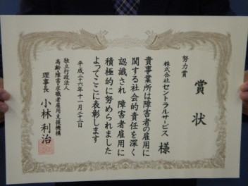 平成26年度障害者雇用優良事業所表彰を受賞しました